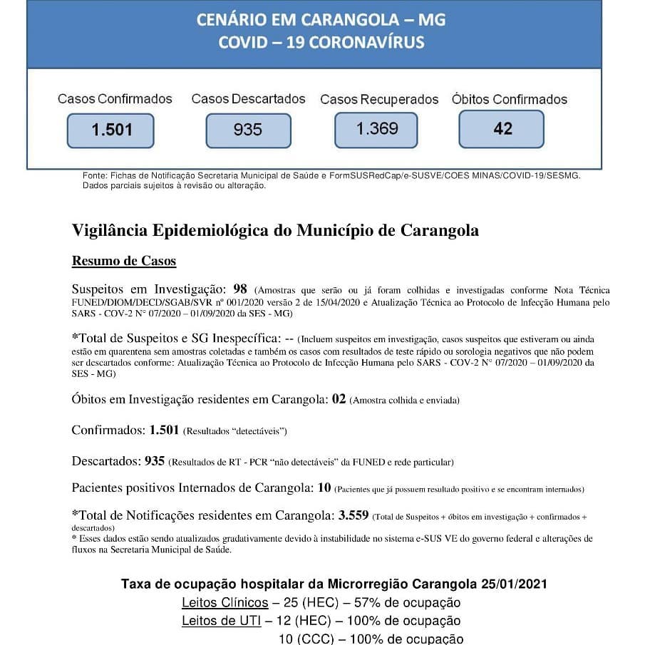 CARANGOLA CONFIRMA MAIS UM ÓBITO POR CORONAVÍRUS E MAIS DOIS ÓBITOS ENCONTRAM-SE EM INVESTIGAÇÃO; ALTO ÍNDICE DE INTERNAÇÕES EM UTI PREOCUPA AUTORIDADES