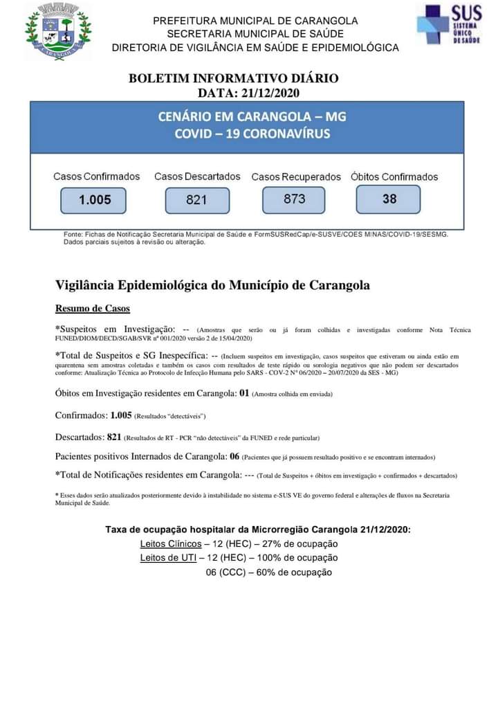 🚨INFORME OFICIAL 😷 Boletim Diário Municipal Epidemiológico SIMPLIFICADO AGENTE CORONAVÍRUS (COVID-19). Dia 21/12/2020, segunda-feira. São registrados 1005 casos confirmados, 821 casos descartados e 873 casos recuperados. 38 óbitos confirmados. RESUMO DE CASOS *Suspeitos em Investigação: — (Amostras que serão ou já foram colhidas e investigadas conforme Nota Técnica FUNED/DIOM/DECD/SGAB/SVR nº 001/2020 versão 2 de 15/04/2020) […]