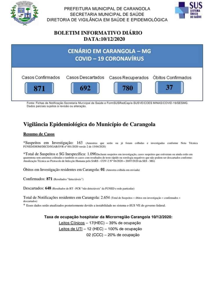 🚨INFORME OFICIAL 😷 Boletim Diário Municipal Epidemiológico SIMPLIFICADO AGENTE CORONAVÍRUS (COVID-19). Dia 10/12/2020, quinta-feira. São registrados 871 casos confirmados, 692 casos descartados e 780 casos recuperados. 37 óbitos confirmados. RESUMO DE CASOS *Suspeitos em Investigação: 163 (Amostras que serão ou já foram colhidas e investigadas conforme Nota Técnica FUNED/DIOM/DECD/SGAB/SVR nº 001/2020 versão 2 de 15/04/2020) […]