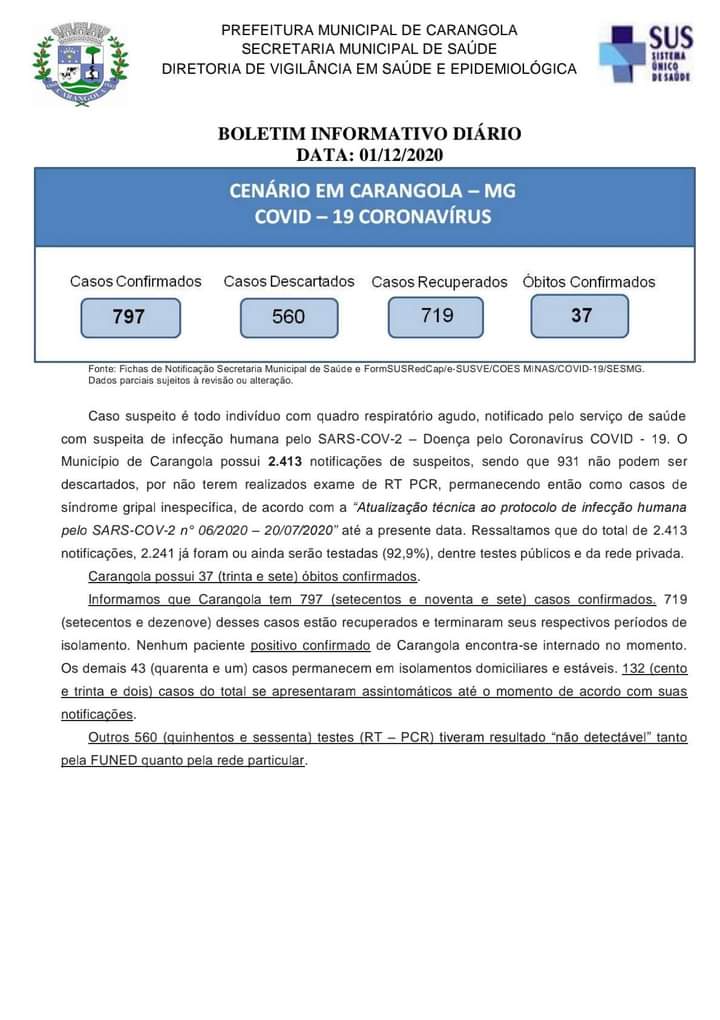 🚨INFORME OFICIAL 😷 Boletim Diário Municipal Epidemiológico AGENTE CORONAVÍRUS (COVID-19). Dia 01/12/2020, terça-feira. São registrados 797 casos confirmados, 560 casos descartados e 719 casos recuperados. 37 óbitos confirmados. RESUMO DE CASOS: Suspeitos em Investigação: 125 (Amostras que serão ou já foram colhidas e investigadas conforme Nota Técnica FUNED/DIOM/DECD/SGAB/SVR nº 001/2020 versão 2 de 15/04/2020) Total […]