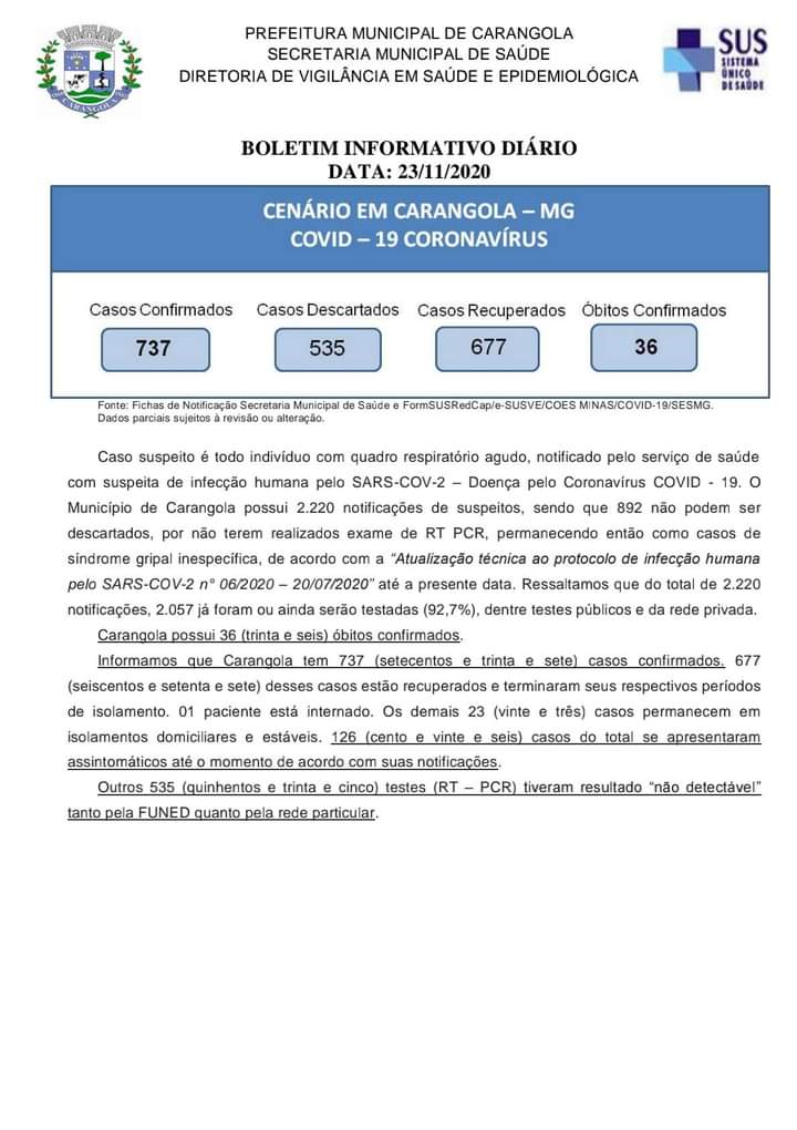 🚨INFORME OFICIAL 😷 Boletim Diário Municipal Epidemiológico AGENTE CORONAVÍRUS (COVID-19). Dia 23/11/2020, segunda-feira. São registrados 737 casos confirmados, 535 casos descartados e 677 casos recuperados. 36 óbitos confirmados. RESUMO DE CASOS: Resumo de Casos Suspeitos em Investigação: 56 (Amostras que serão ou já foram colhidas e investigadas conforme Nota Técnica FUNED/DIOM/DECD/SGAB/SVR nº 001/2020 versão 2 […]