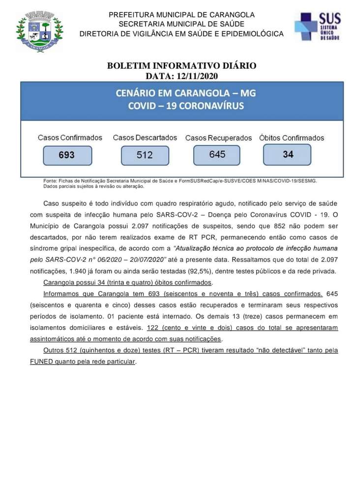 🚨INFORME OFICIAL 😷 Boletim Diário Municipal Epidemiológico AGENTE CORONAVÍRUS (COVID-19). Dia 12/11/2020, quinta-feira. São registrados 693 casos confirmados, 512 casos descartados e 645 casos recuperados. 34 óbitos confirmados. RESUMO DE CASOS: Suspeitos em Investigação: 40 (Amostras que serão ou já foram colhidas e investigadas conforme Nota Técnica FUNED/DIOM/DECD/SGAB/SVR nº 001/2020 versão 2 de 15/04/2020) Total […]