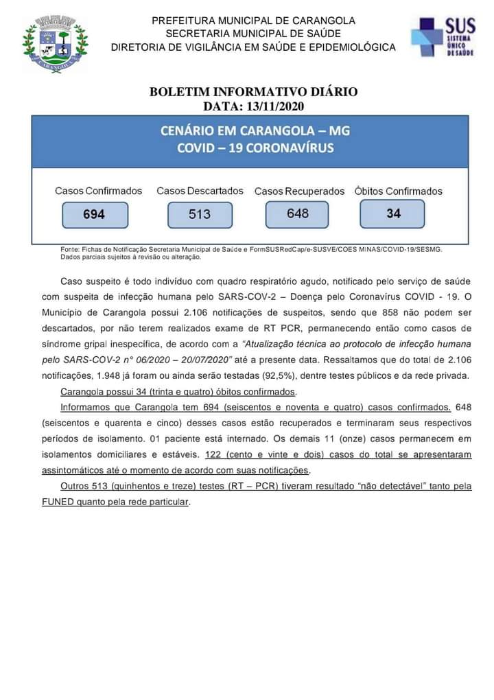 🚨INFORME OFICIAL 😷 Boletim Diário Municipal Epidemiológico AGENTE CORONAVÍRUS (COVID-19). Dia 13/11/2020, sexta-feira. São registrados 694 casos confirmados, 513 casos descartados e 648 casos recuperados. 34 óbitos confirmados. RESUMO DE CASOS: Suspeitos em Investigação: 41 (Amostras que serão ou já foram colhidas e investigadas conforme Nota Técnica FUNED/DIOM/DECD/SGAB/SVR nº 001/2020 versão 2 de 15/04/2020) Total […]