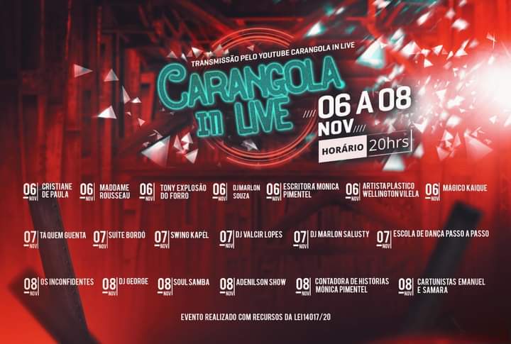 Nasce um Grande Projeto!!! Serão 3 (tres) dias de LIVES com artistas de Carangola. Dias 06, 07 e 08 de Novembro Transmissão AO VIVO em FULL HD – By: AEROMÍDIA DIGITAL (32) 99987 7811 Se inscreva no canal do YOUTUBE – CARANGOLA IN LIVE Não perca!!!