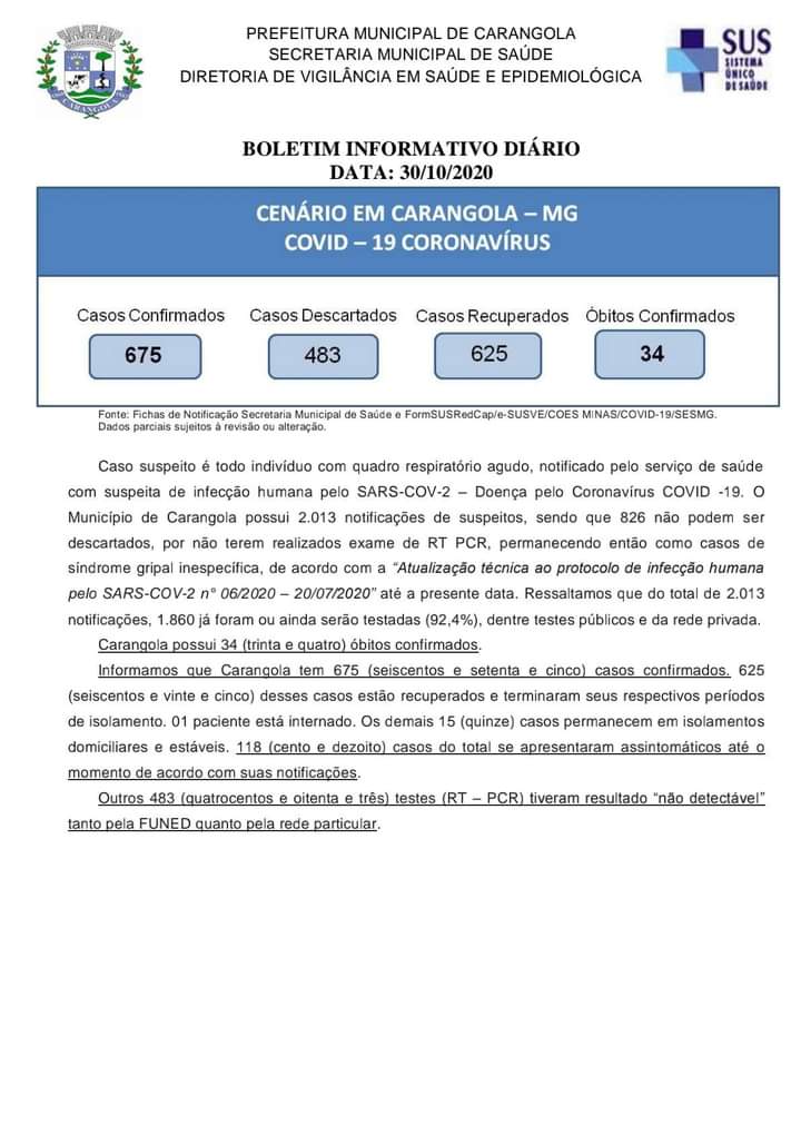 🚨INFORME OFICIAL 😷 Boletim Diário Municipal Epidemiológico AGENTE CORONAVÍRUS (COVID-19). Dia 30/10/2020, sexta-feira. São registrados 675 casos confirmados, 483 casos descartados e 625 casos recuperados. 34 óbitos confirmados. RESUMO DE CASOS: Suspeitos em Investigação: 29 (Amostras que serão ou já foram colhidas e investigadas conforme Nota Técnica FUNED/DIOM/DECD/SGAB/SVR nº 001/2020 versão 2 de 15/04/2020) Total […]