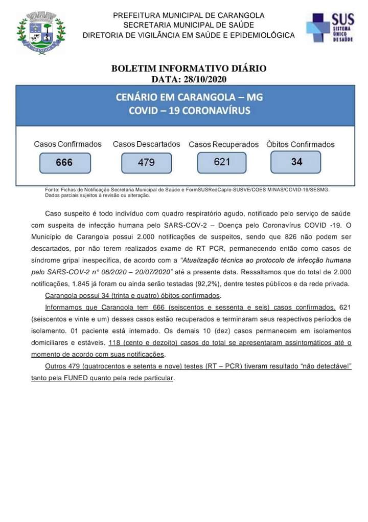 🚨INFORME OFICIAL 😷 Boletim Diário Municipal Epidemiológico AGENTE CORONAVÍRUS (COVID-19). Dia 28/10/2020, quarta-feira. São registrados 666 casos confirmados, 479 casos descartados e 621 casos recuperados. 34 óbitos confirmados. RESUMO DE CASOS: Suspeitos em Investigação: 29 (Amostras que serão ou já foram colhidas e investigadas conforme Nota Técnica FUNED/DIOM/DECD/SGAB/SVR nº 001/2020 versão 2 de 15/04/2020) Total […]