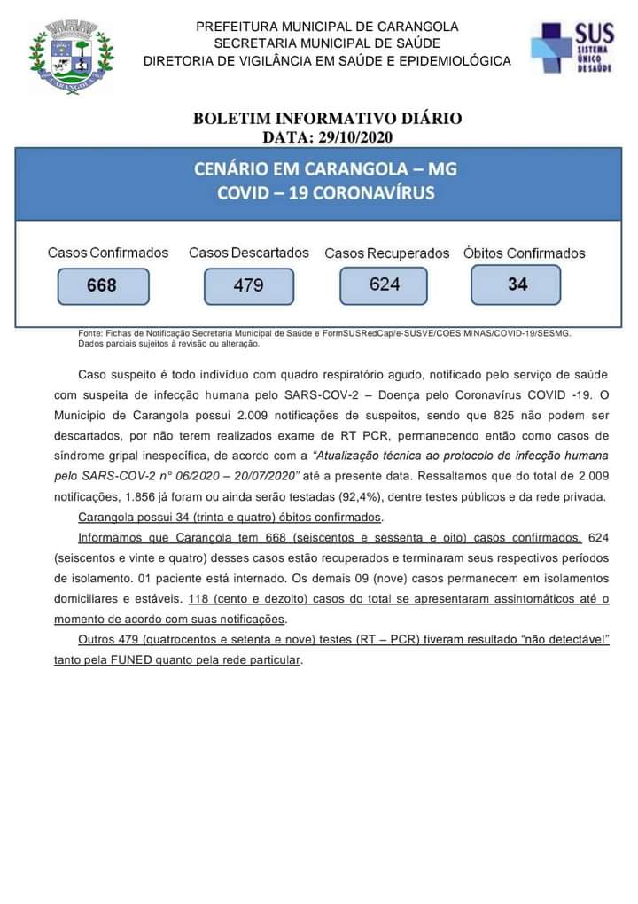 🚨INFORME OFICIAL 😷 Boletim Diário Municipal Epidemiológico AGENTE CORONAVÍRUS (COVID-19). Dia 29/10/2020, quinta-feira. São registrados 668 casos confirmados, 479 casos descartados e 624 casos recuperados. 34 óbitos confirmados. RESUMO DE CASOS: Suspeitos em Investigação: 37 (Amostras que serão ou já foram colhidas e investigadas conforme Nota Técnica FUNED/DIOM/DECD/SGAB/SVR nº 001/2020 versão 2 de 15/04/2020) Total […]