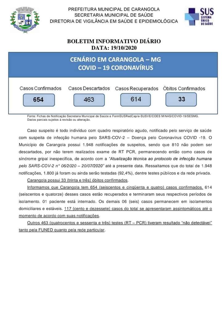 🚨INFORME OFICIAL 😷 Boletim Diário Municipal Epidemiológico AGENTE CORONAVÍRUS (COVID-19). Dia 19/10/2020, segunda-feira. São registrados 654 casos confirmados, 463 casos descartados e 614 casos recuperados. 33 óbitos confirmados. RESUMO DE CASOS: Suspeitos em Investigação: 21 (Amostras que serão ou já foram colhidas e investigadas conforme Nota Técnica FUNED/DIOM/DECD/SGAB/SVR nº 001/2020 versão 2 de 15/04/2020) Total […]