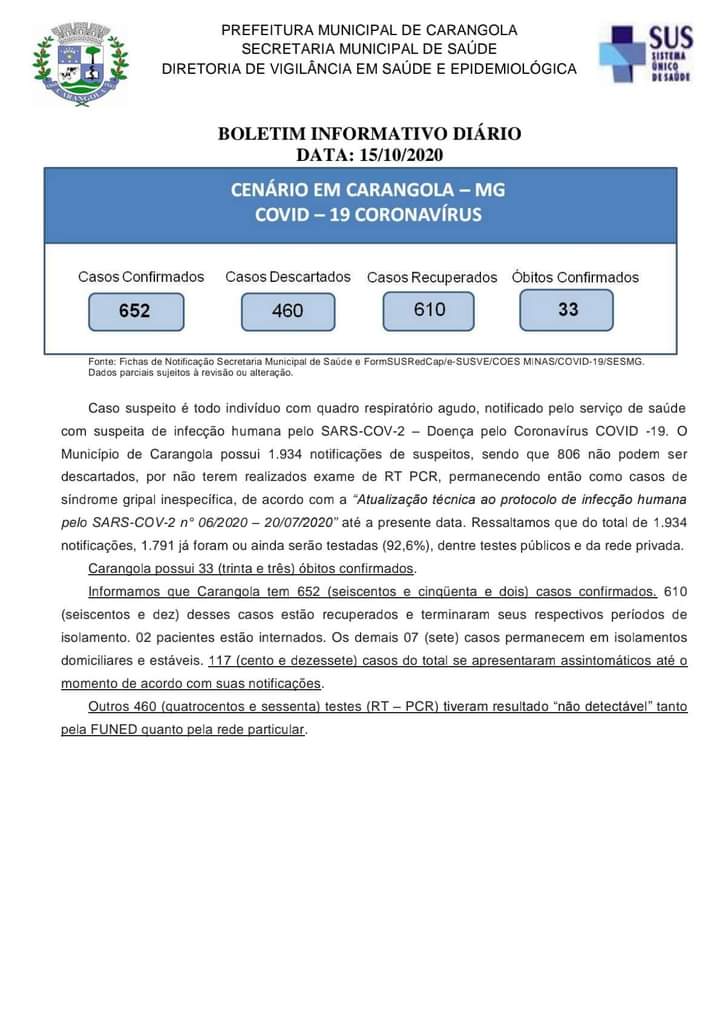 🚨INFORME OFICIAL 😷 Boletim Diário Municipal Epidemiológico AGENTE CORONAVÍRUS (COVID-19). Dia 15/10/2020, quinta-feira. São registrados 652 casos confirmados, 460 casos descartados e 610 casos recuperados. 33 óbitos confirmados. RESUMO DE CASOS: Suspeitos em Investigação: 16 (Amostras que serão ou já foram colhidas e investigadas conforme Nota Técnica FUNED/DIOM/DECD/SGAB/SVR nº 001/2020 versão 2 de 15/04/2020). Total […]
