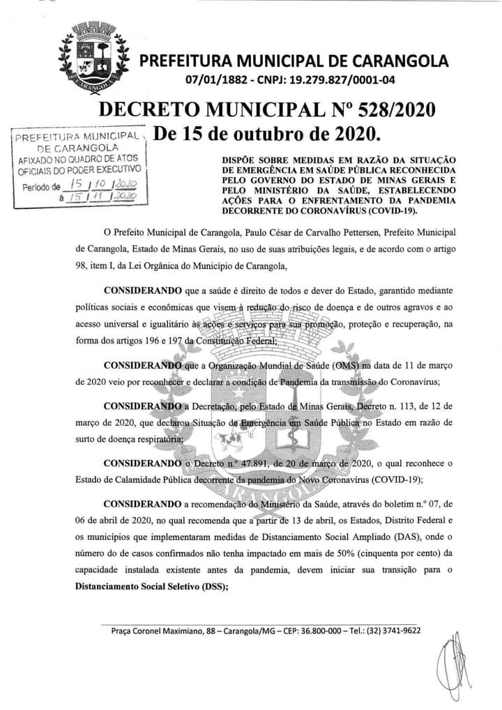 SAIU NOVO DECRETO MUNICIPAL COM NOVAS MEDIDAS DE FLEXIBILIZAÇÃO PARA CARANGOLA; CLIQUE E VEJA O QUE MUDOU