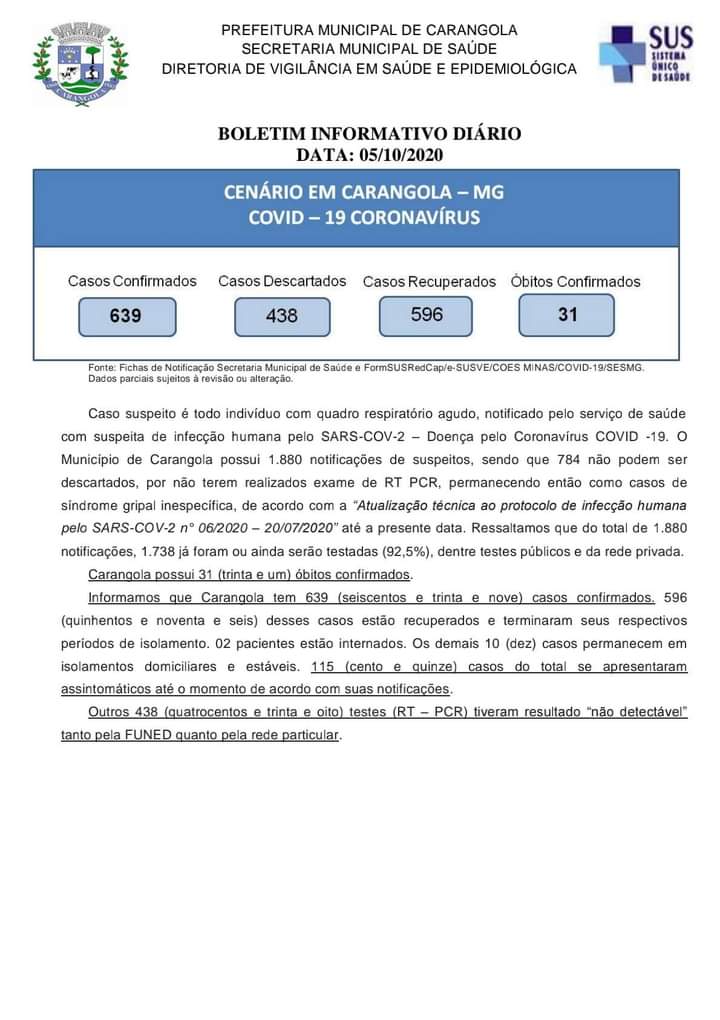 🚨INFORME OFICIAL 😷 Boletim Diário Municipal Epidemiológico AGENTE CORONAVÍRUS (COVID-19). Dia 05/10/2020, segunda-feira. São registrados 639 casos confirmados, 438 casos descartados e 596 casos recuperados. 31 óbitos confirmados. RESUMO DE CASOS: Suspeitos em Investigação: 19 (Amostras que serão ou já foram colhidas e investigadas conforme Nota Técnica FUNED/DIOM/DECD/SGAB/SVR nº 001/2020 versão 2 de 15/04/2020). Total […]