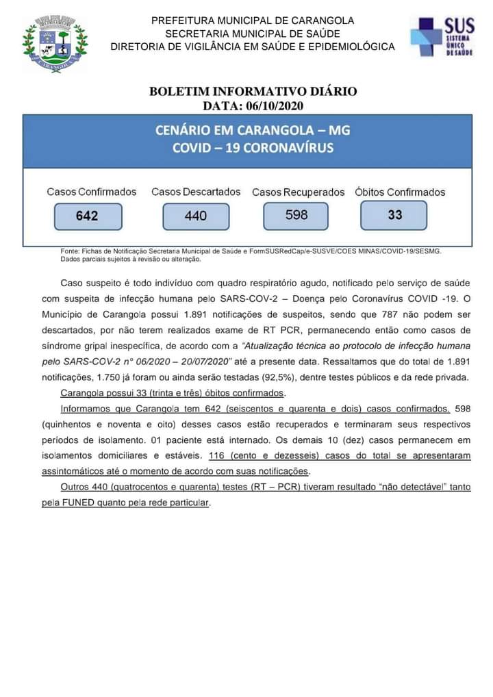 🚨INFORME OFICIAL 😷 Boletim Diário Municipal Epidemiológico AGENTE CORONAVÍRUS (COVID-19). Dia 06/10/2020, terça-feira. São registrados 642 casos confirmados, 440 casos descartados e 598 casos recuperados. 33 óbitos confirmados. RESUMO DE CASOS: Suspeitos em Investigação: 22 (Amostras que serão ou já foram colhidas e investigadas conforme Nota Técnica FUNED/DIOM/DECD/SGAB/SVR nº 001/2020 versão 2 de 15/04/2020). Total […]