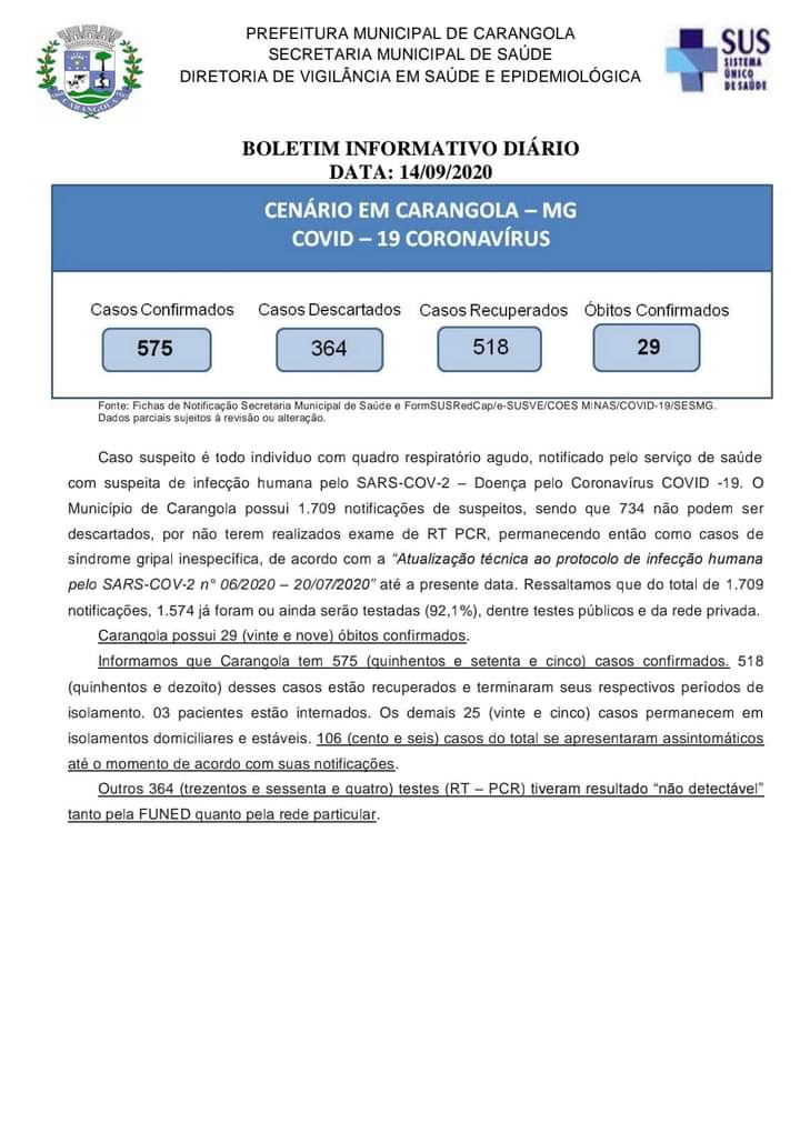 🚨INFORME OFICIAL 😷 Boletim Diário Municipal Epidemiológico AGENTE CORONAVÍRUS (COVID-19). Dia 14/09/2020, segunda-feira. São registrados 575 casos confirmados, 364 casos descartados e 518 casos recuperados. 29 óbitos confirmados. RESUMO DE CASOS: Suspeitos em Investigação: 36 (Amostras que serão ou já foram colhidas e investigadas conforme Nota Técnica FUNED/DIOM/DECD/SGAB/SVR nº 001/2020 versão 2 de 15/04/2020) Total […]