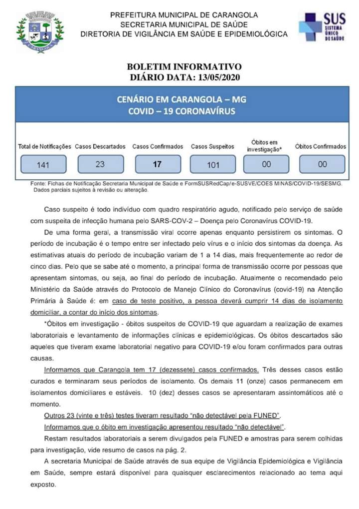 CARANGOLA TEM 20 CASOS CONFIRMADOS DE CORONAVÍRUS, SENDO 4 CURADOS E 16 EM ISOLAMENTO DOMICILIAR