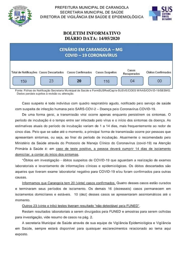⚠INFORME OFICIAL‼ Boletim Diário Municipal Epidemiológico AGENTE CORONAVÍRUS (COVID-19). Dia 14/05/2020, quinta-feira. É registrado 159 casos notificados. 04 casos recuperados. 20 CASOS CONFIRMADOS ‼️ Resumo de Casos Suspeitos em Investigação: 18 (Amostras que serão colhidas e investigadas conforme Nota Técnica FUNED/DIOM/DECD/SGAB/SVR nº 001/2020 versão 2 de 15/04/2020). Total de Suspeitos: 116 (Incluem suspeitos em investigação, […]