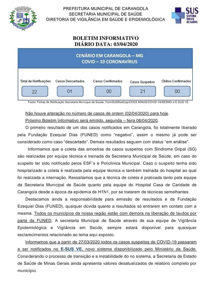 VALE RESSALTAR QUE A DEMORA NA EMISSÃO DE RESULTADOS É DA Fundação Ezequiel Dias (FUNED), E NÃO DA SECRETARIA MUNICIPAL DE SAÚDE OU CASA DE CARIDADE DE CARANGOLA! ⚠INFORME OFICIAL Boletim Diário Municipal Epidemiológico AGENTE CORONAVÍRUS (COVID-19). Dia 03/04/2020. Até o momento, existem 22 (Vinte e dois) casos notificados em Carangola. Não houve alteração no […]