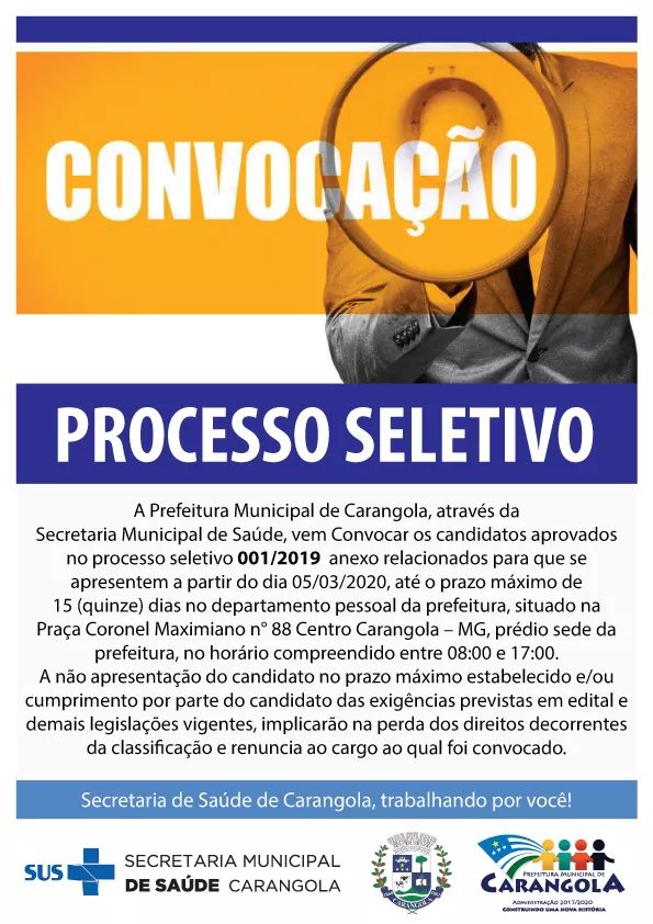 A Prefeitura Municipal de Carangola, através da Secretaria Municipal de Saúde, vem convocar os candidatos aprovados no processo seletivo 001/2019 anexo relacionados para que se apresentem a partir do dia 05/03/2020, até o prazo máximo de 15 (quinze) dias no departamento pessoal da prefeitura, situado na Praça Coronel Maximiano n° 88 Centro Carangola – MG, […]