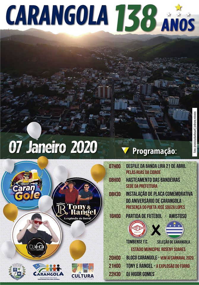 É com grande satisfação que dirigimo-nos aos Senhores(as), com a finalidade de convidá-los, a participar conosco das festividades alusivas ao 138º. Aniversário de Emancipação Política do município de Carangola-MG. Vossa presença muito nos honrará.Esperamos por vocês! Fonte: Prefeitura Municipal de Carangola.