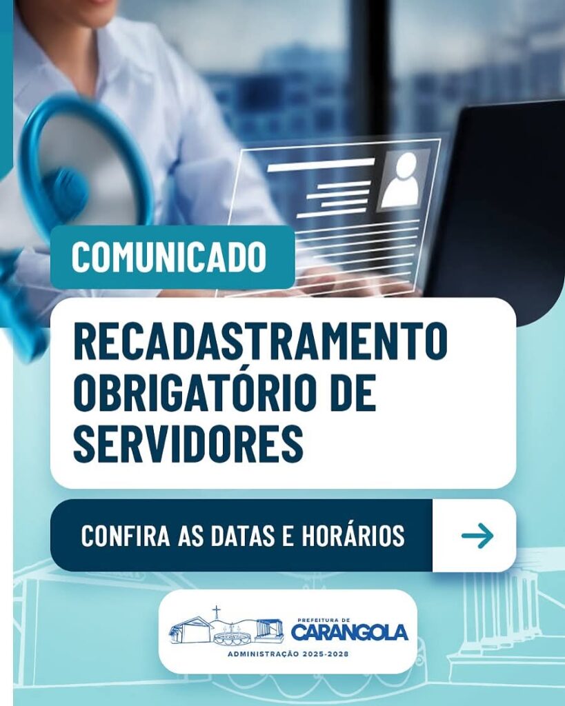 RECADASTRAMENTO OBRIGATÓRIO DE SERVIDORES O recadastramento obrigatório de servidores está acontecendo no saguão da prefeitura de hoje, segunda-feira (03/02), até sexta-feira (07/02). Faça seu recadastramento pelo link: http://recadastramento.carangola.mg.gov.br Após o recadastramento, vá até o saguão da Prefeitura para assinatura do Termo de Autorização de uso de dados. Conforme Decreto, o não recadastramento ou o não comparecimento […]