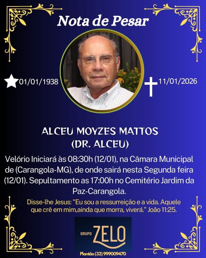 O Doutor Alceu, como era mais conhecido, foi Prefeito de Carangola no início dos anos 80, sendo muito conhecido e querido pelos carangolenses. Aos familiares, nossos mais sinceros sentimentos! Que Deus o receba em sua Glória e que Ele console todos os familiares!