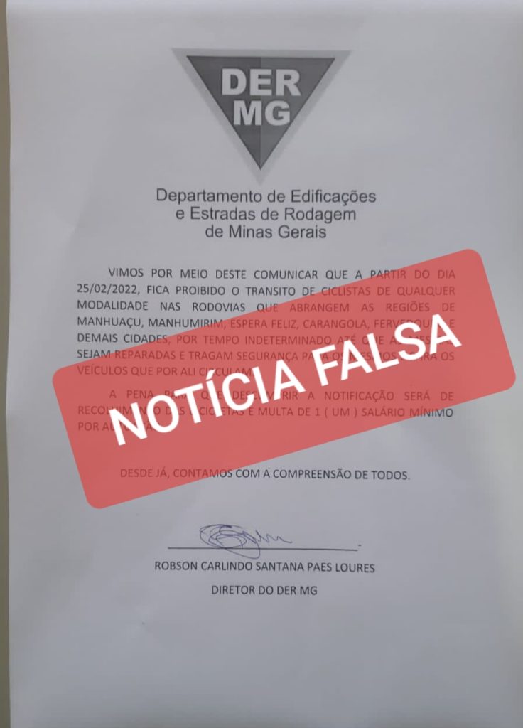 Viralizou na internet um falso ofício que que seria do DER-MG e que estaria proibindo o trânsito de bicicletas nas rodovias estaduais da região. Segundo informações, não passou de uma brincadeira direcionada a apenas uma pessoa, e o FALSO OFÍCIO vazou, tendo muita gente acreditado no falso “documento”. Porém, fica aqui o alerta de que […]