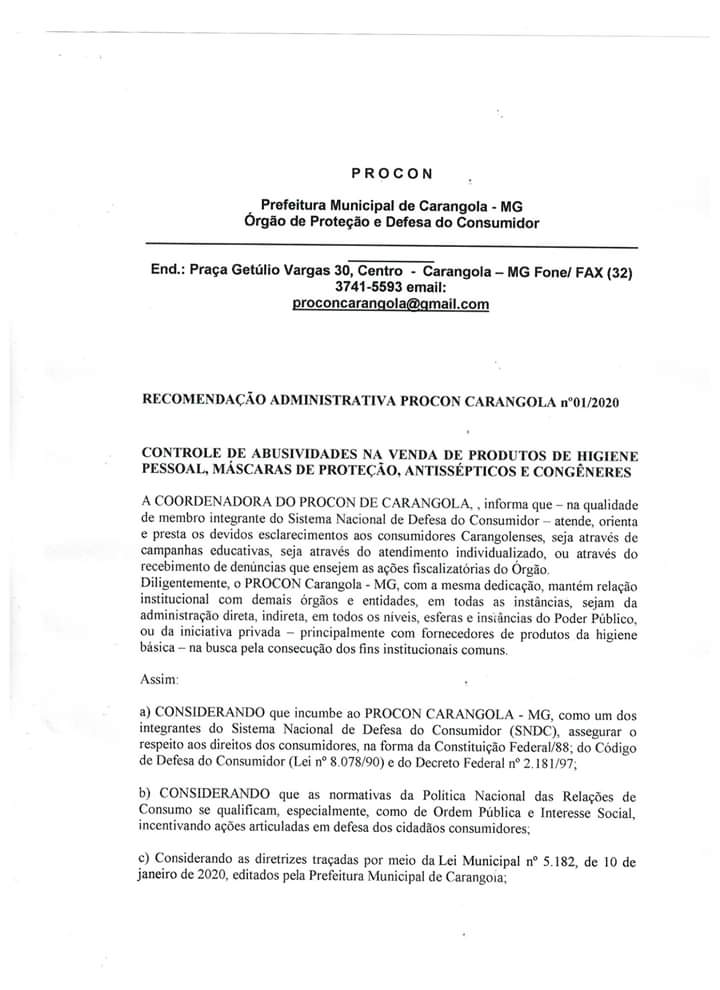 IMPORTANTE: RECOMENDAÇÃO ADMINISTRATIVA PROCON CARANGOLA nº01/2020 que trata do CONTROLE DE ABUSIVIDADES NA VENDA DE PRODUTOS DE HIGIENE PESSOAL, MÁSCARAS DE PROTEÇÃO, ANTISSÉPTICOS E CONGÊNERES. A COORDENADORA DO PROCON DE CARANGOLA, , informa que – na qualidade de membro integrante do Sistema Nacional de Defesa do Consumidor – atende, orienta e presta os devidos esclarecimentos […]