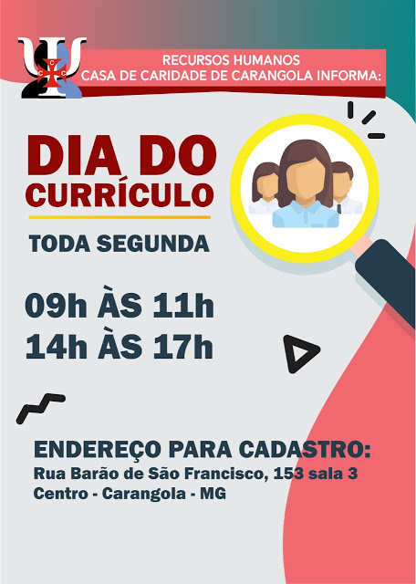 O departamento de Recursos Humanos do Hospital Casa de Caridade de Carangola cria o DIA DO CURRÍCULO. Os candidatos às vagas de emprego poderão deixar seus currículos toda segunda-feira, de 09h às 11h e de 14h às 17h, na Rua Barão de São Francisco, 153 Sala 03, Centro em Carangola. Outra opção de cadastro de […]