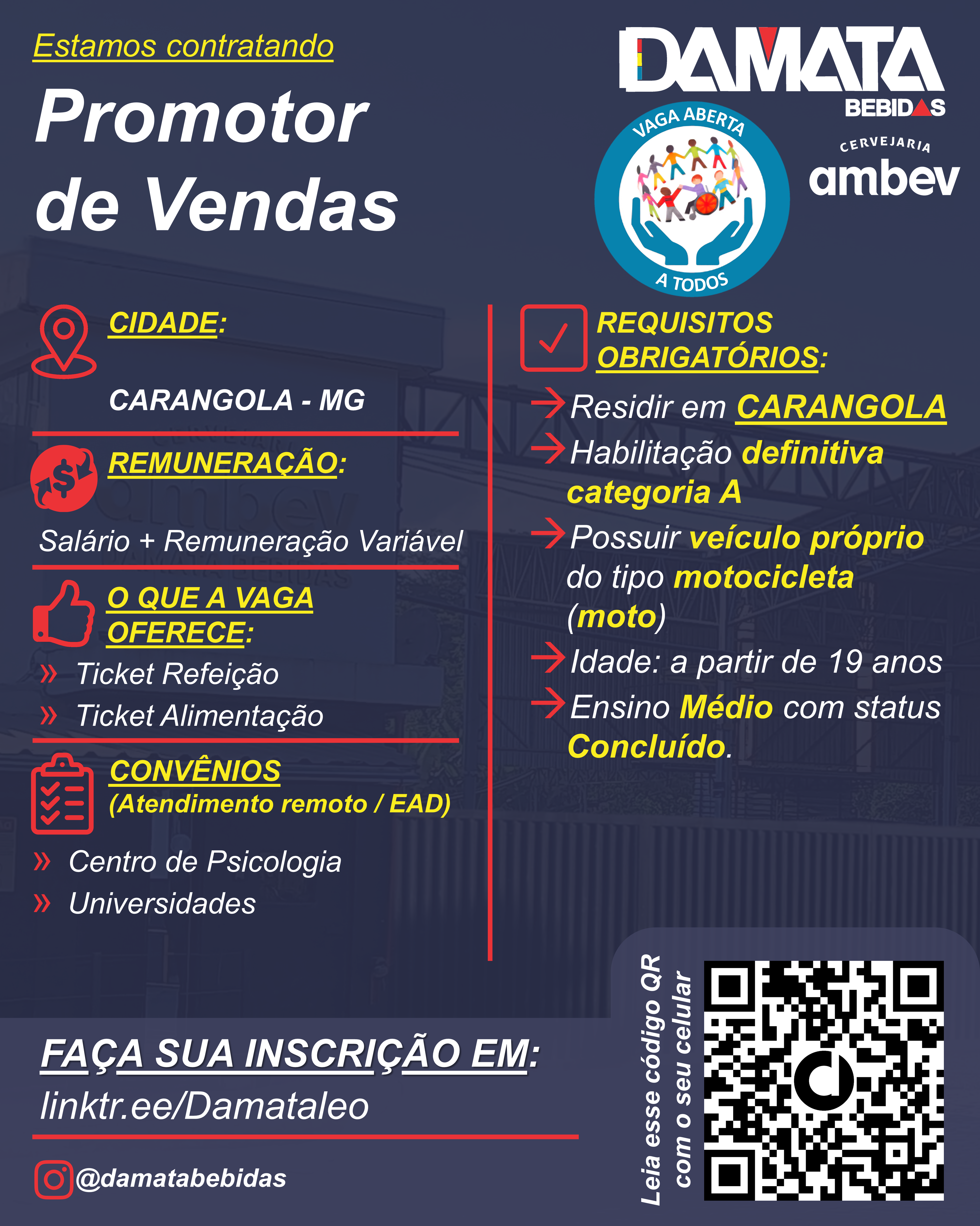 Cargo: PROMOTOR [VENDAS]. Descrição: Promotor (a) de Vendas na cidade de CARANGOLA. Vaga para todos os gêneros, cores e crenças. Procuramos por um perfil ousado, que queira sonhar grande com o time Damata. É ótimo ter: boa comunicação e curiosidade. É obrigatório ter: Ensino Médio completo, CNH categoria A definitiva e moto própria. Para sua segurança: precisamos […]