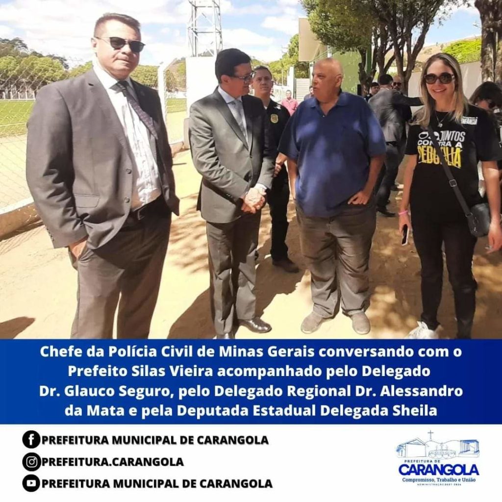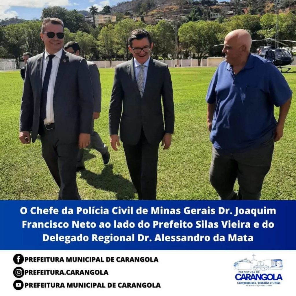 Carangola recebeu nesta sexta-feira (12/08), a visita oficial do chefe da Polícia Civil de Minas Gerais (PCMG), Dr. Joaquim Francisco Neto e Silva. Ele foi recebido pelo Prefeito Silas Vieira, pelo Delegado Regional de Muriaé, Dr. Alessandro da Mata, pelo Delegado de Carangola Dr. Glauco Seguro e pelo Delegado de Tombos Dr. José Geraldo Teixeira. Acompanhavam a comitiva do Chefe da Policia Civil, a Deputada Estadual Delegada Sheila e a Dra Flávia Murta do 4º Departamento de Polícia Civil de Juiz de Fora.
