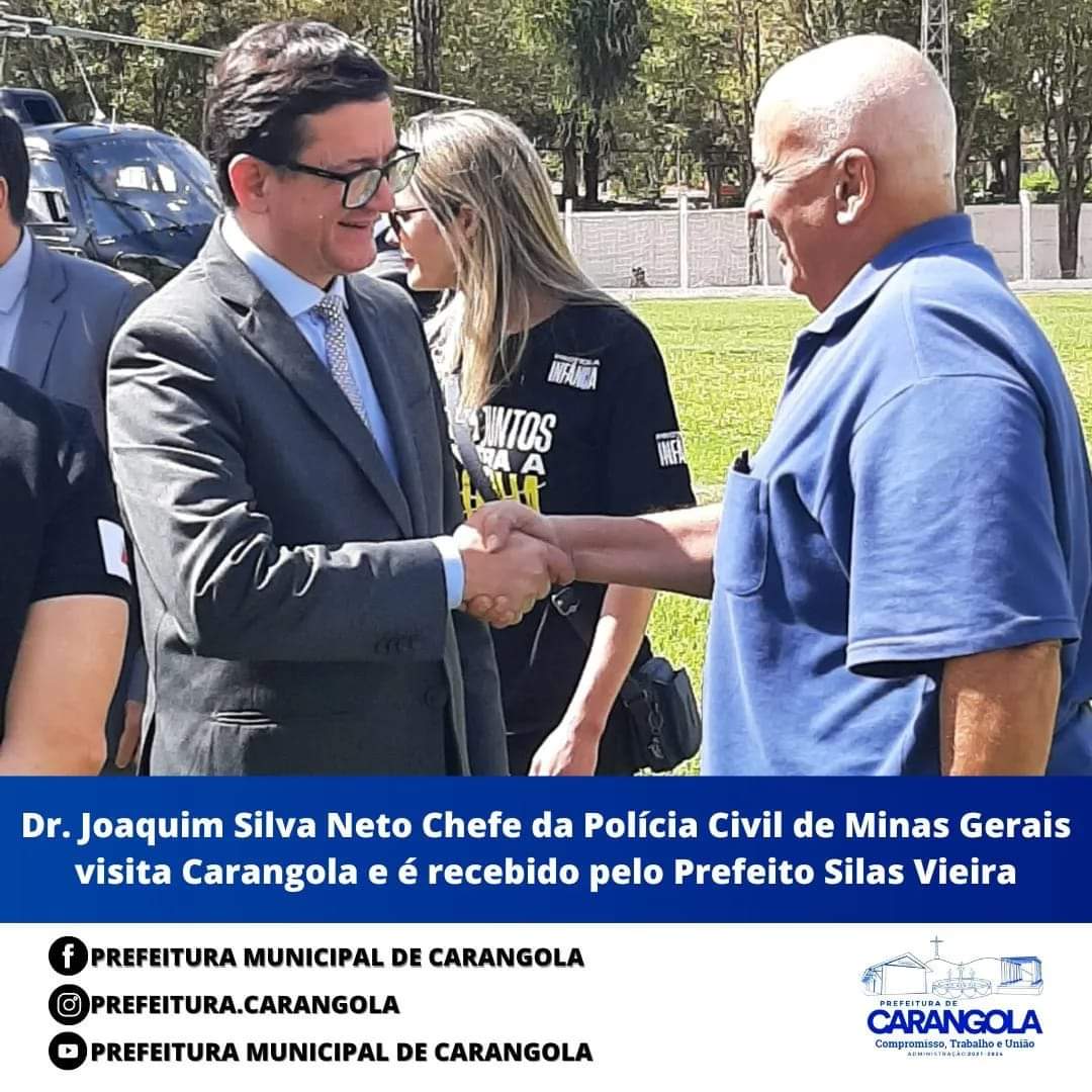 Carangola recebeu nesta sexta-feira (12/08), a visita oficial do chefe da Polícia Civil de Minas Gerais (PCMG), Dr. Joaquim Francisco Neto e Silva. Ele foi recebido pelo Prefeito Silas Vieira, pelo Delegado Regional de Muriaé, Dr. Alessandro da Mata, pelo Delegado de Carangola Dr. Glauco Seguro e pelo Delegado de Tombos Dr. José Geraldo Teixeira. Acompanhavam a comitiva do Chefe da Policia Civil, a Deputada Estadual Delegada Sheila e a Dra Flávia Murta do 4º Departamento de Polícia Civil de Juiz de Fora.