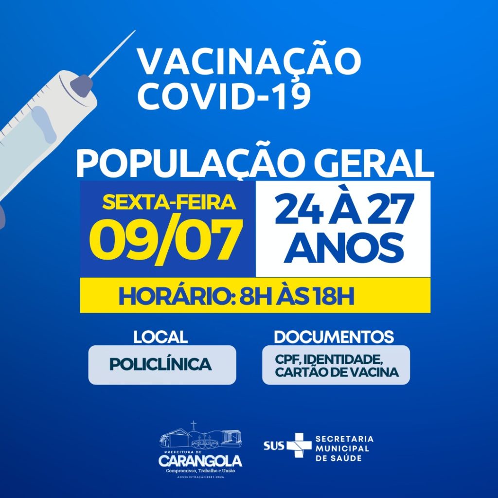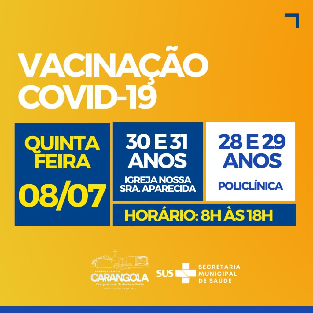 CLIQUE E CONFIRA A FAIXA ETÁRIA DE VACINAÇÃO COVID-19 EM CARANGOLA PARA ESTA QUINTA-FEIRA (08) E SEXTA-FEIRA (09) 7 de julho de 2021 FONTE: PREFEITURA DE CARANGOLA