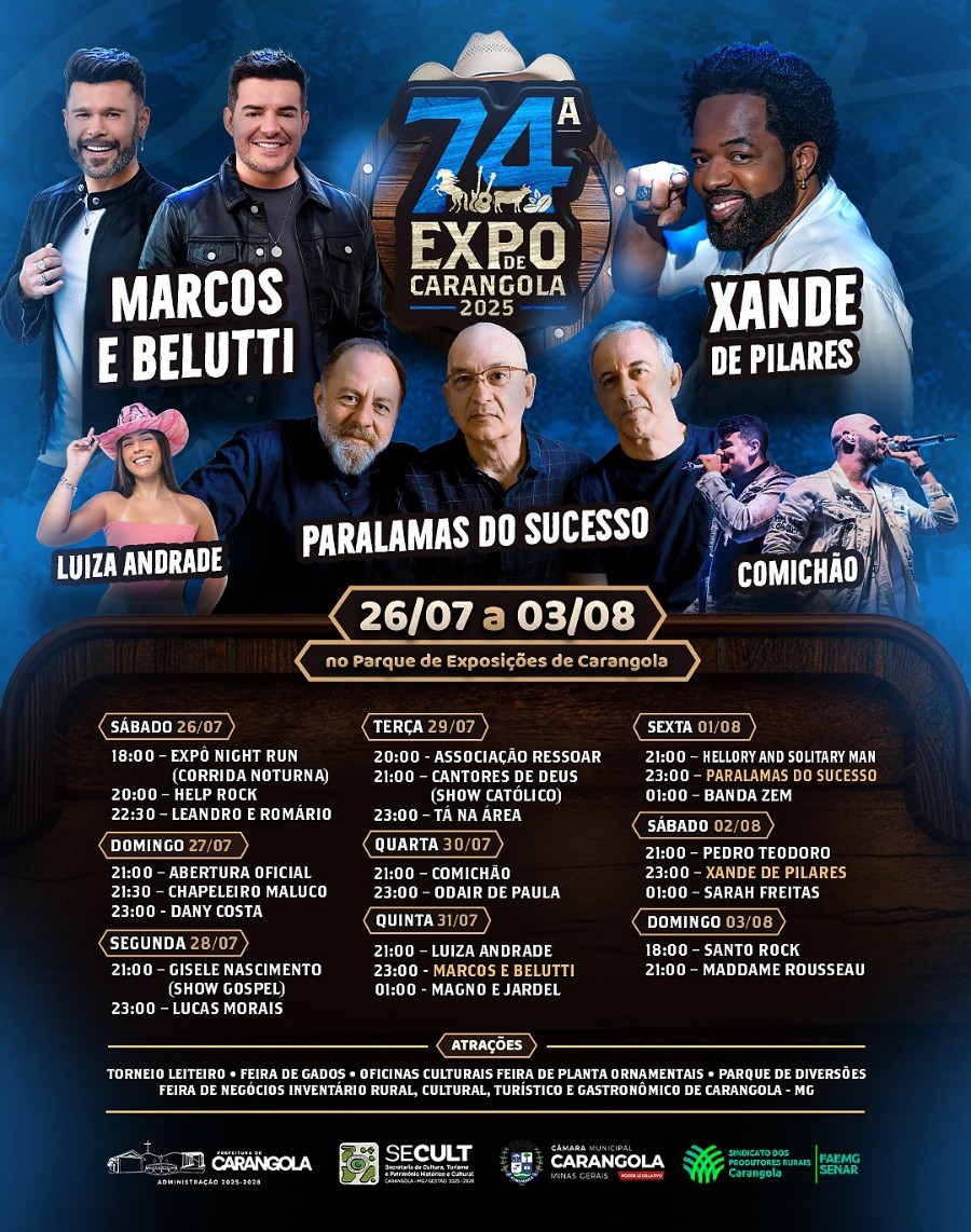 CONFIRA A PROGRAMAÇÃO OFICIAL COMPLETA DA EXPO CARANGOLA 2025; CLIQUE E CONFIRA TUDO SOBRE O MAIOR EVENTO DA REGIÃO!
