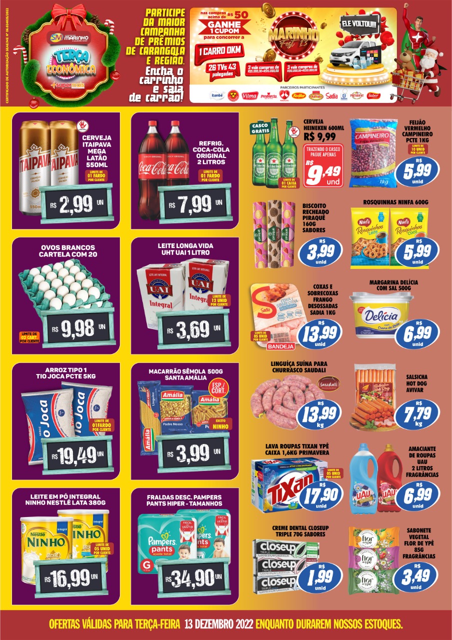 CONFIRA AS OFERTAS SENSACIONAIS DOS SUPERMERCADOS MARINHO PARA ESTA TERÇA-FEIRA DE ECONOMIA 12 de dezembro de 2022 HORÁRIO DE ATENDIMENTO REDUZIDO DEVIDO O FERIADO NA CIDADE DE CARANGOLA; Supermercados Marinho: Preço e Qualidade é aqui! Compre e concorra a prêmios sensacionais!!! Aproveite!!!