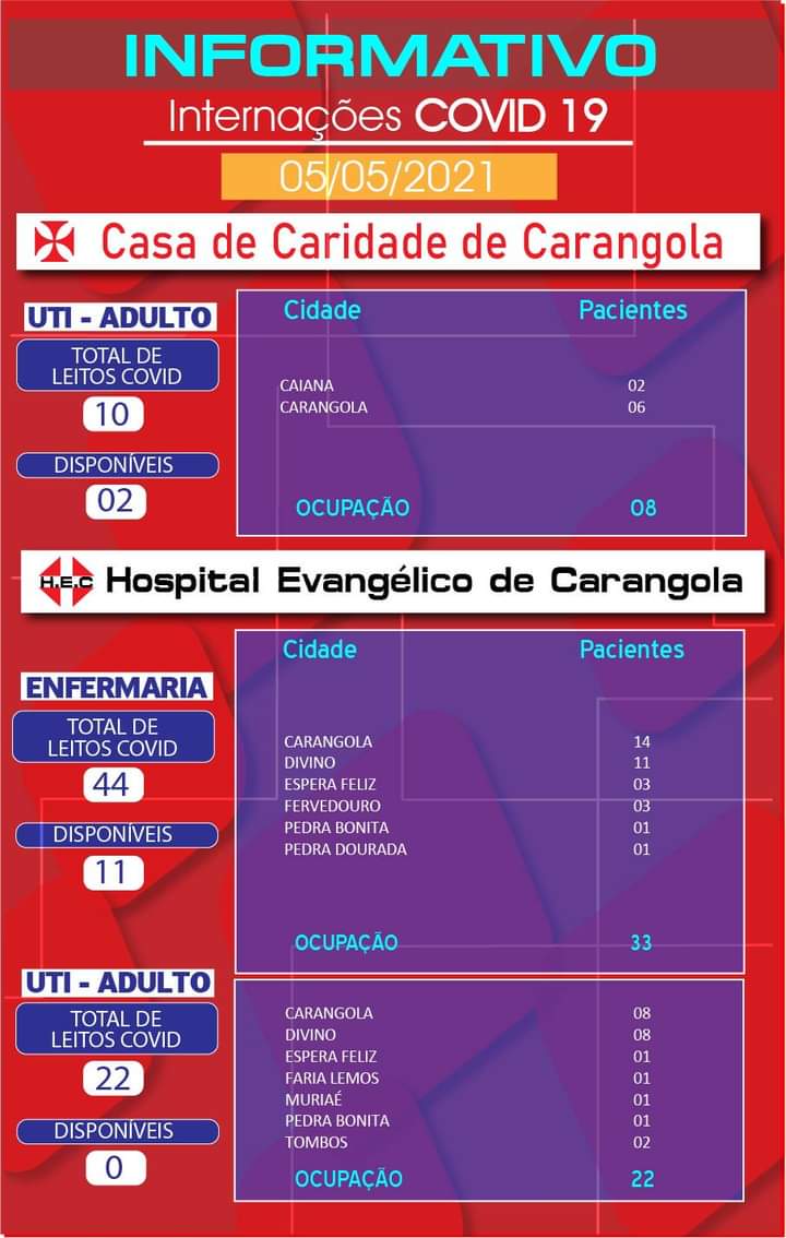 CONFIRA DE ONDE SÃO OS PACIENTES COVID-19 INTERNADOS NA CASA DE CARIDADE E NO HOSPITAL EVANGÉLICO DE CARANGOLA – INFORMATIVO 05/05/2021