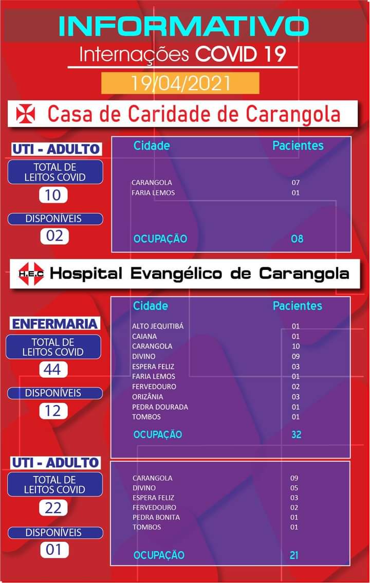 CONFIRA DE ONDE SÃO OS PACIENTES COVID-19 INTERNADOS NA CASA DE CARIDADE E NO HOSPITAL EVANGÉLICO DE CARANGOLA – INFORMATIVO 19/04/2021