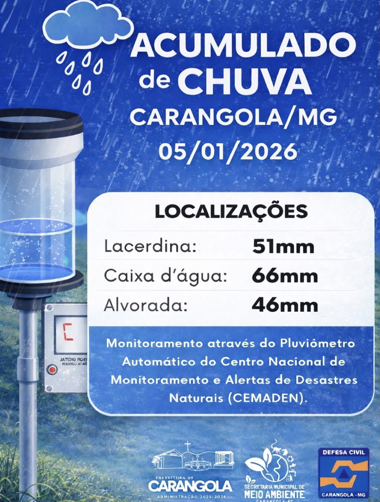 As chuvas registradas no município de Carangola seguem sendo monitoradas de forma contínua. Confira os volumes acumulados nas localidades acompanhadas pelos pluviômetros automáticos do CEMADEN nesta segunda (05):