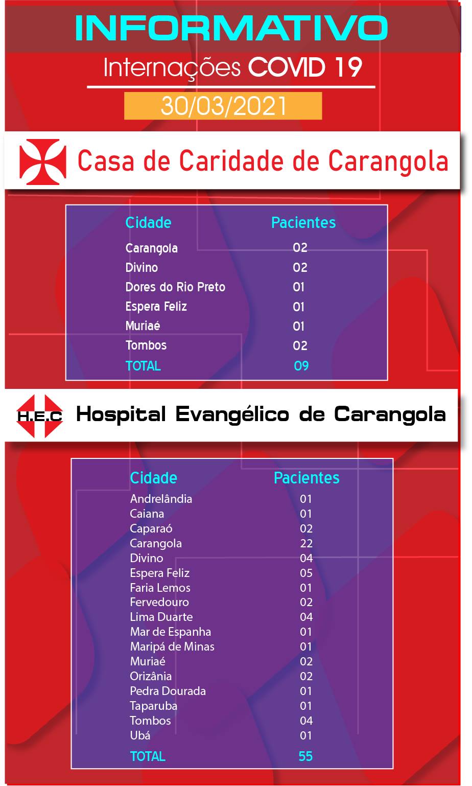 CONFIRA O INFORMATIVO COM A CIDADE DE ORIGEM DE PACIENTES COVID-19 INTERNADOS NA CASA DE CARIDADE E NO HOSPITAL EVANGÉLICO DE CARANGOLA – 30/03/2021