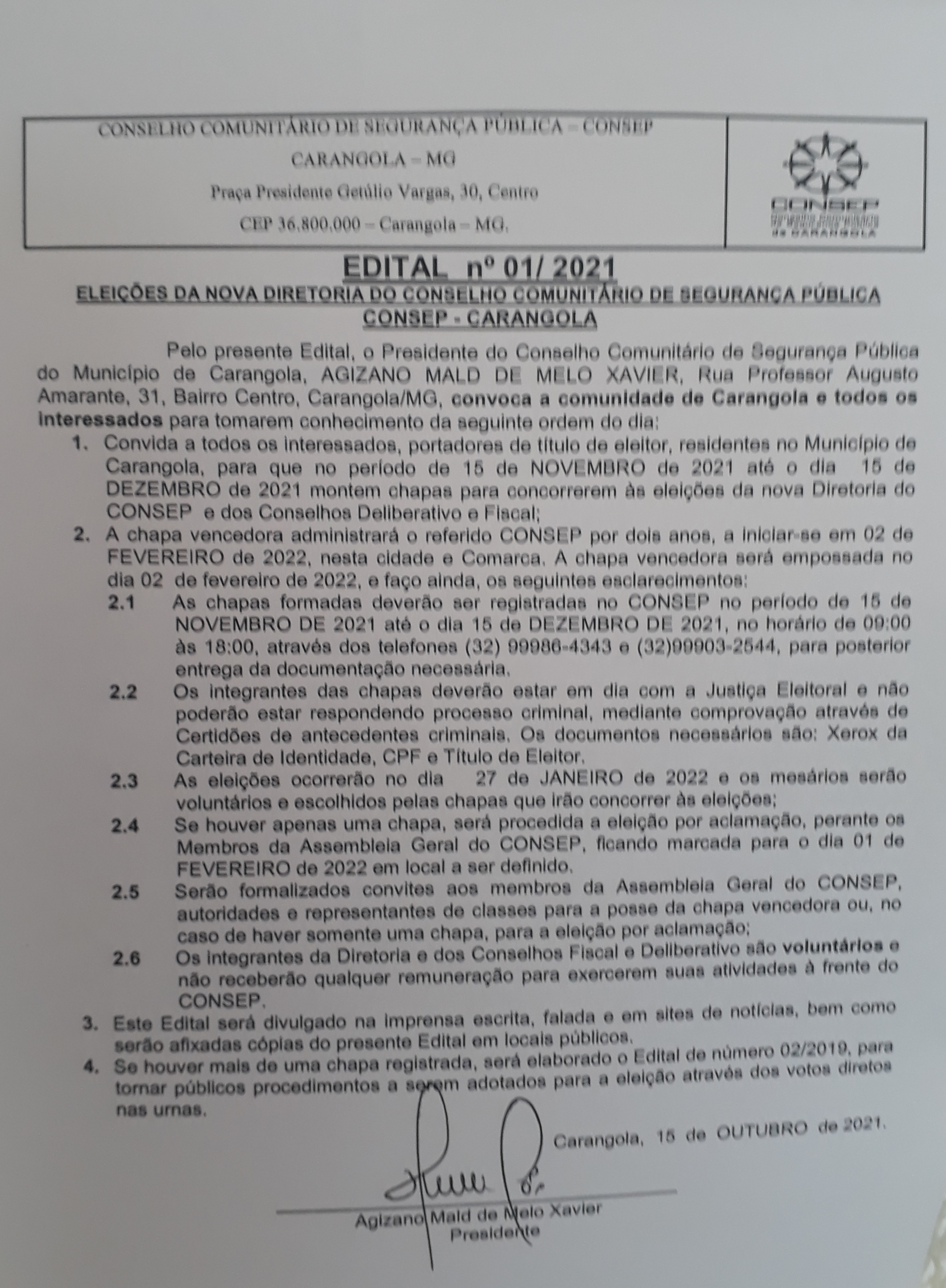 O CONSEP – CONSELHO COMUNITÁRIO DE SEGURANÇA PÚBLICA de Carangola torna público o edital acima para formação de chapa para a eleição da nova diretoria.