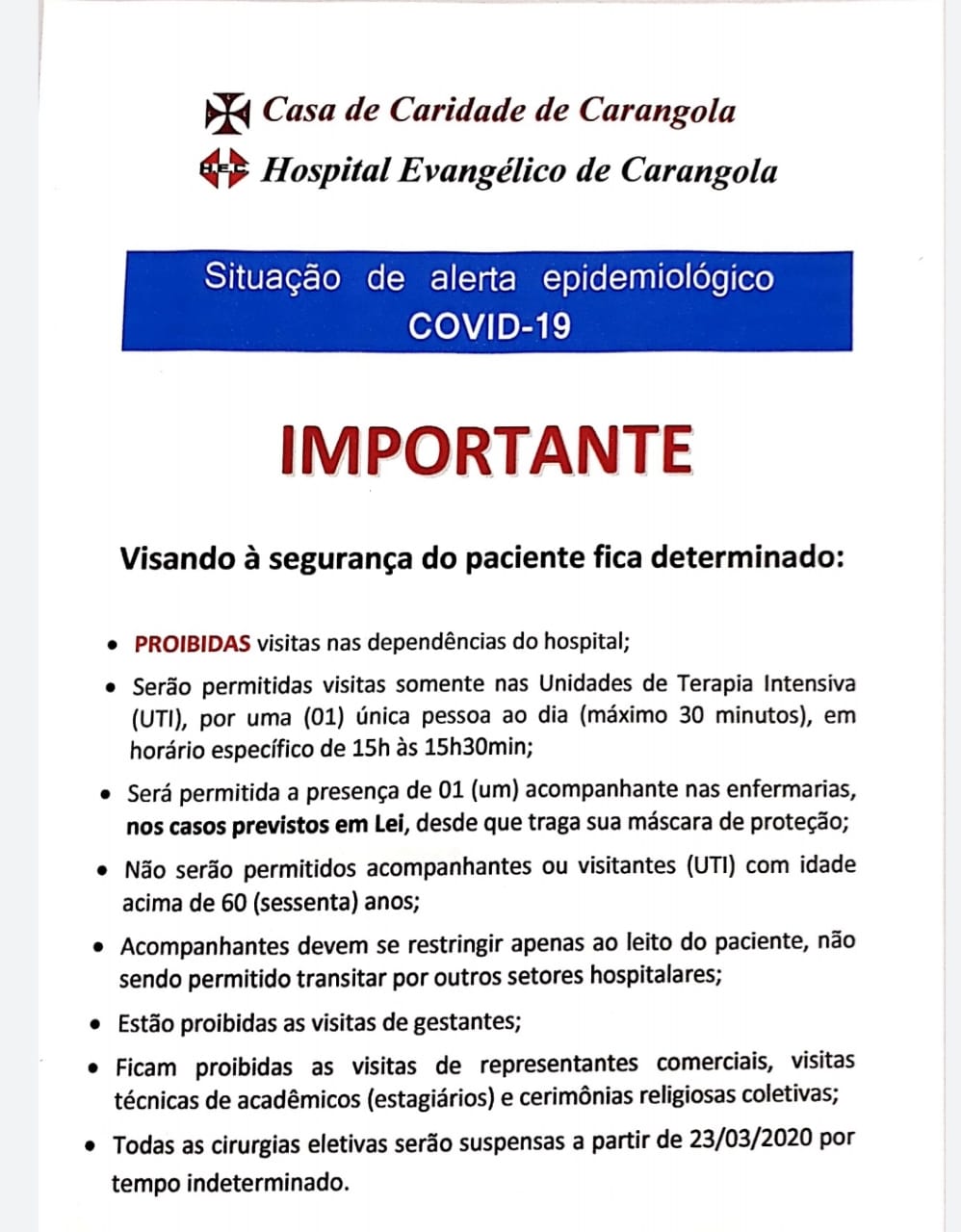 CORONAVÍRUS: CASA DE CARIDADE E HOSPITAL EVANGÉLICO DE CARANGOLA PROÍBEM VISITAS E SUSPENDERÃO CIRURGIAS ELETIVAS; CLIQUE E CONFIRA DEMAIS MEDIDAS ADOTADAS