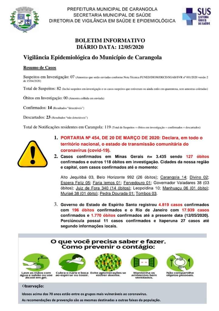 Suspeitos em Investigação: 07 (Amostras que serão enviadas conforme Nota Técnica FUNED/DIOM/DECD/SGAB/SVR nº 001/2020 versão 2 de 15/04/2020). Total de Suspeitos: 82 (Inclui suspeitos em investigação e os casos suspeitos que estiveram ou ainda estão em quarentena, sem amostras coletadas). Óbitos em Investigação: 00 (Amostra colhida em enviada). Confirmados: 14 (Resultados “detectáveis”). Descartados: 23 (Resultados “não detectáveis”). Total de Notificações residentes em Carangola: 119 (Total de Suspeitos + óbitos em investigação + confirmados + descartados).