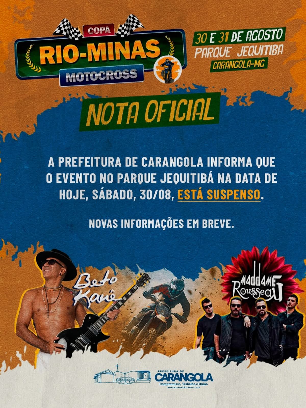 A Prefeitura de Carangola informa que o evento no Parque Jequitibá, neste sábado, 30/08, está suspenso.