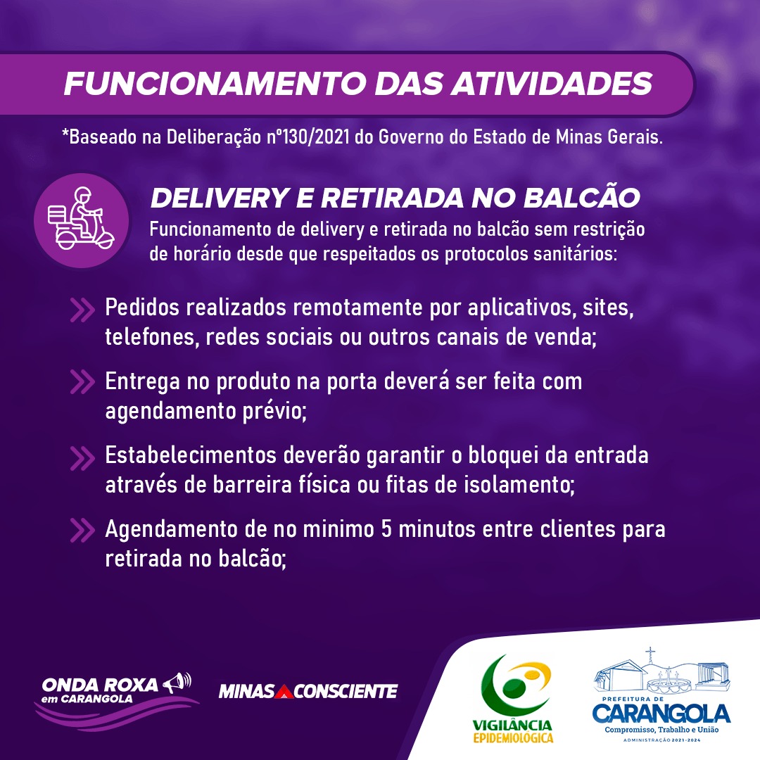 DECRETO MUNICIPAL ESTABELECE: SERVIÇOS DELIVERY OU COM RETIRADA NO BALCÃO NÃO POSSUEM HORÁRIO DE RESTRIÇÃO NA ONDA ROXA; CLIQUE E CONFIRA