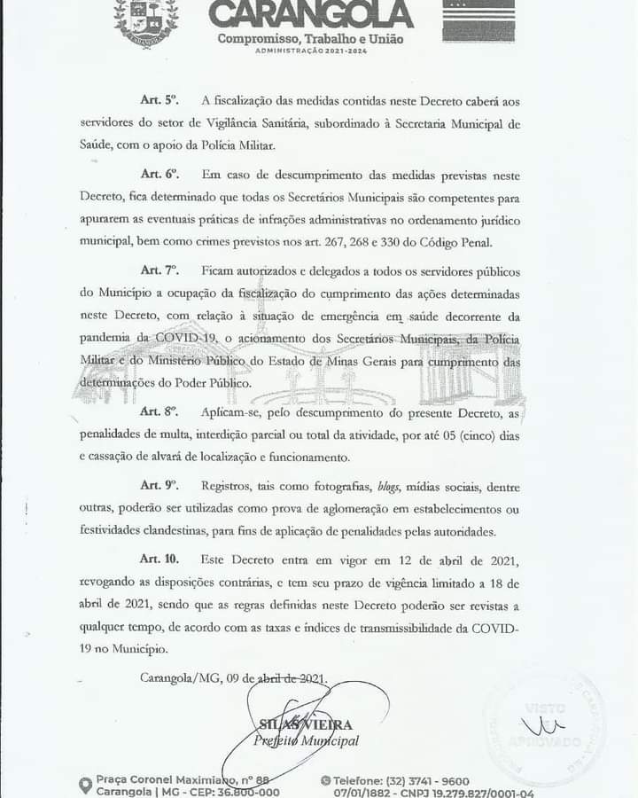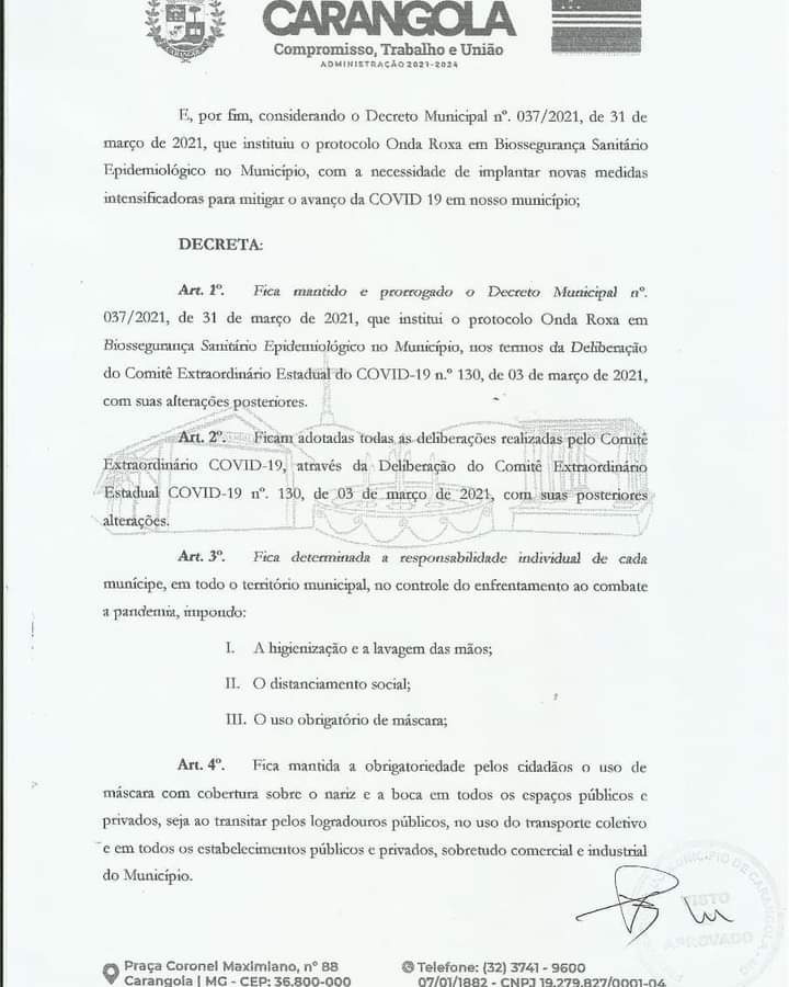 DECRETO MUNICIPAL PRORROGA ONDA ROXA EM CARANGOLA ATÉ O DIA 18/04