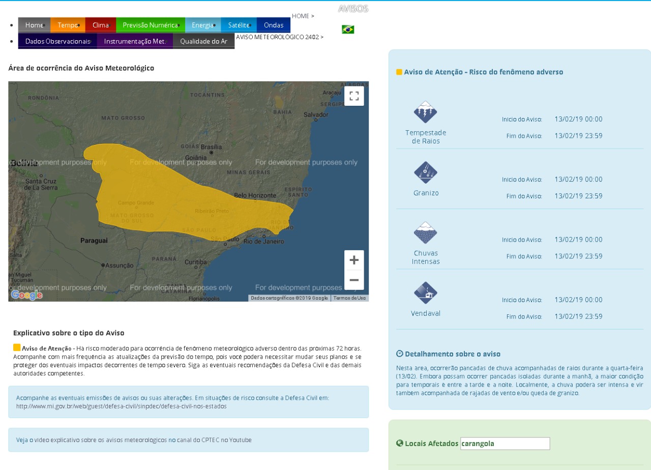 O INPE/CPTEC emitiu um alerta para a região da zona da mata relatando sobre mudanças no tempo.