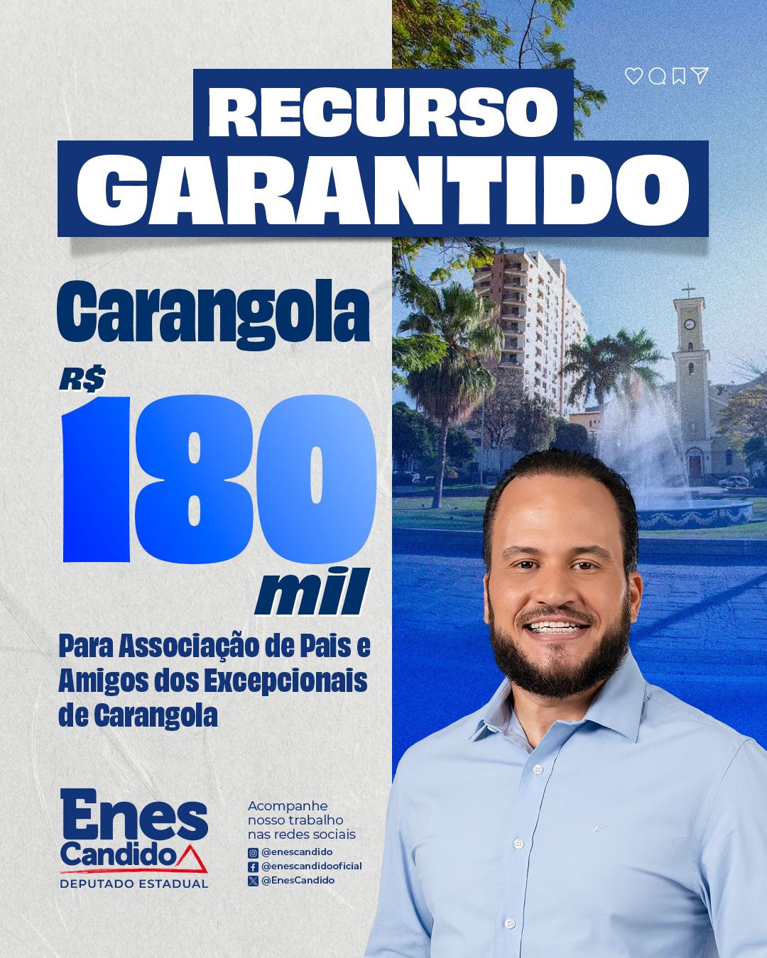 O Deputado Estadual Enes Candido garantiu o recurso no valor de 180 mil reais para a APAE DE CARANGOLA (Associação de Pais e Amigos dos Excepcionais de Carangola), recurso este que vai ser empregado no custeio e manutenção das atividades desenvolvidas por aquele instituição.