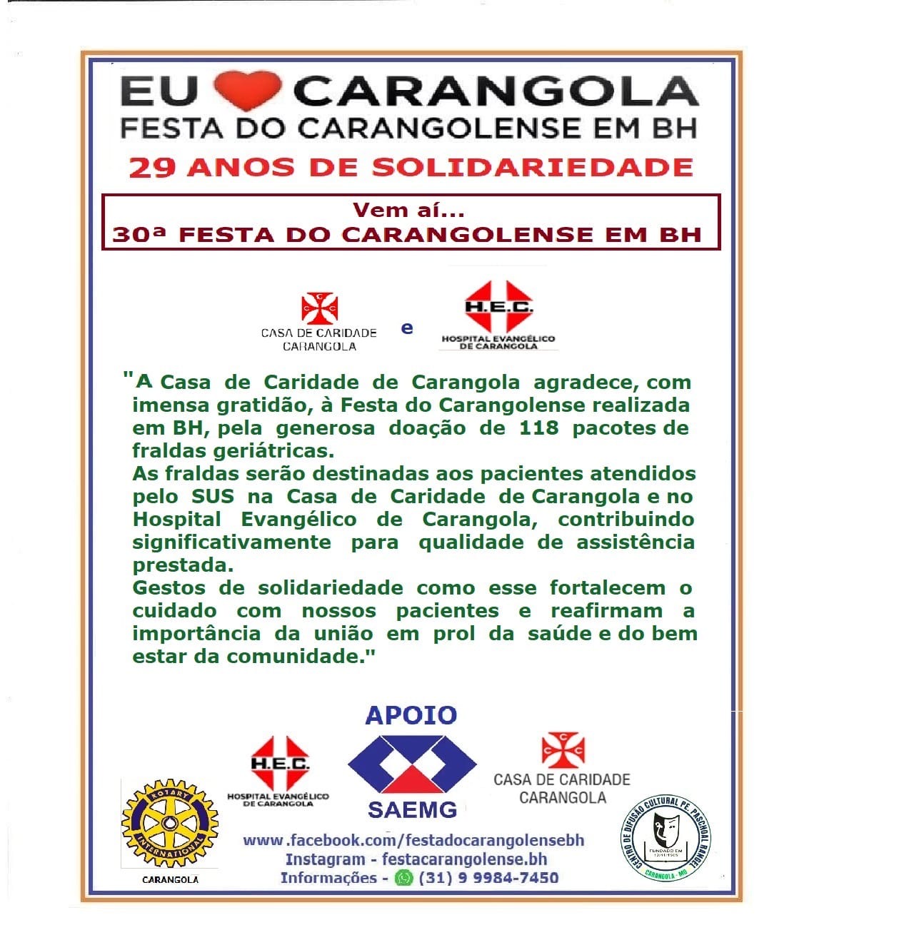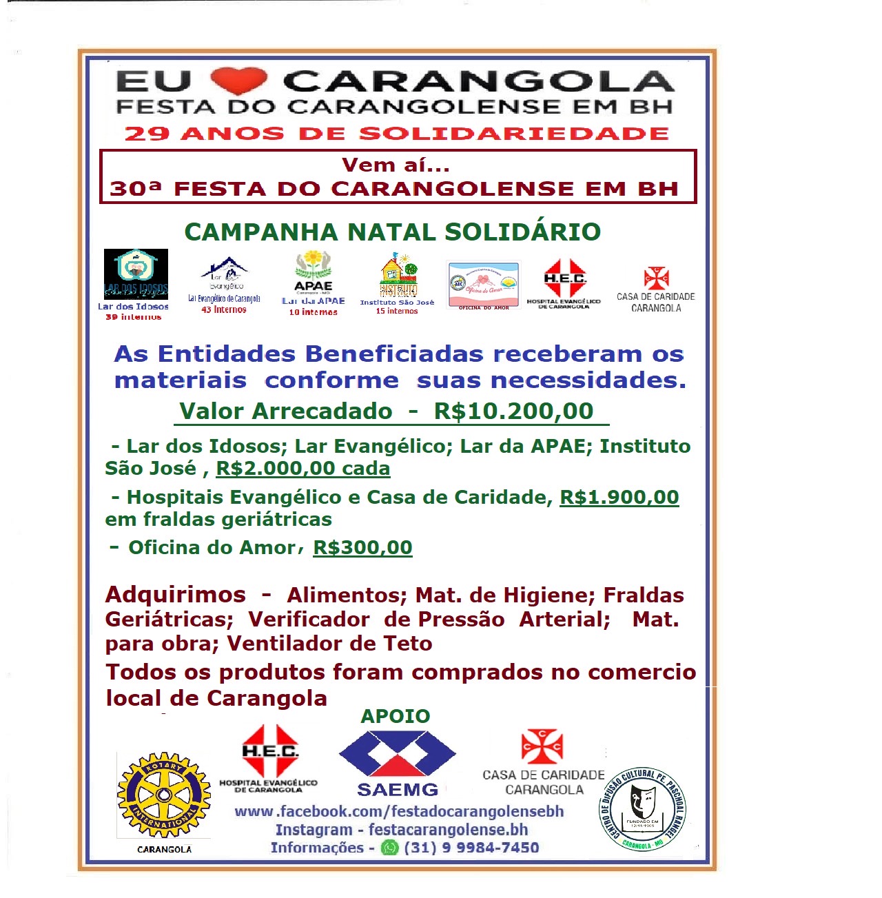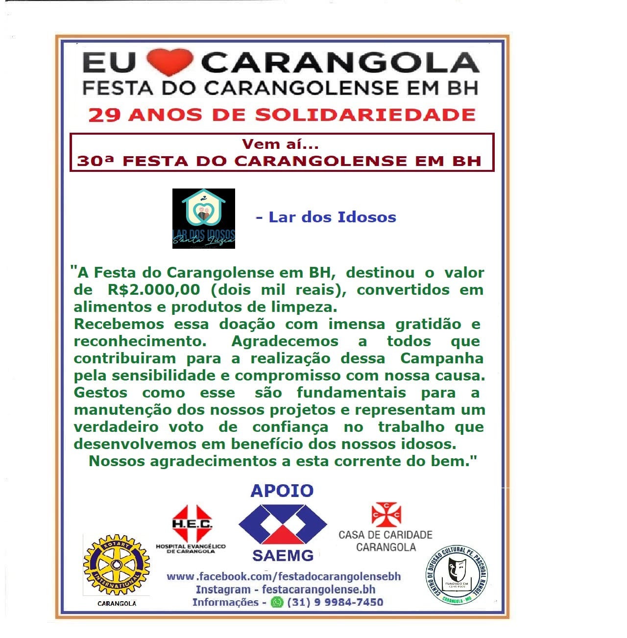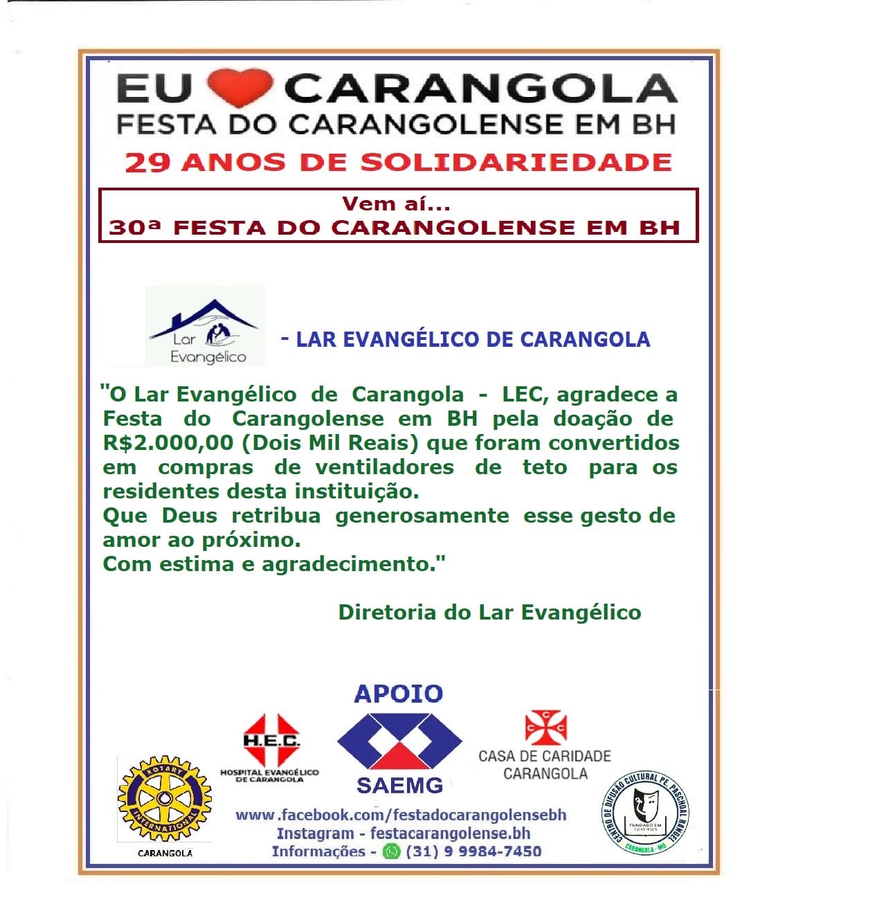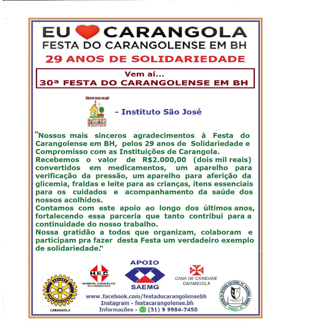 As entidades agradeceram a Festa do Carangolense em BH: