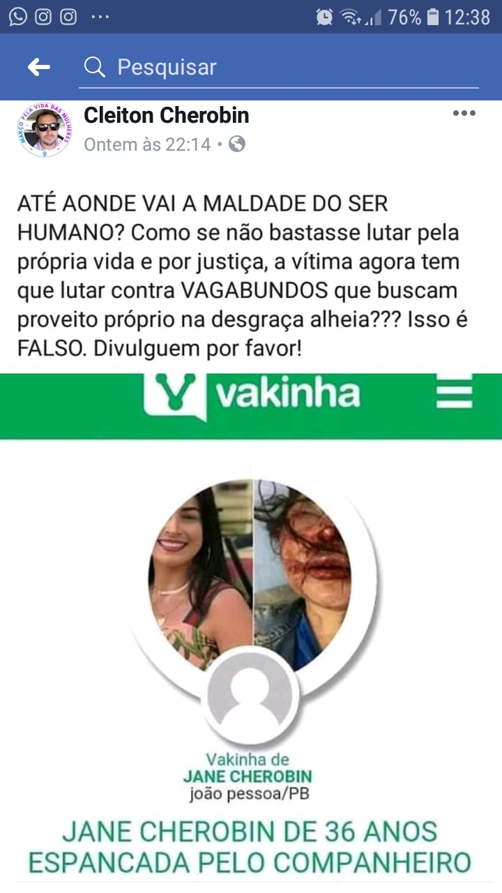 Apareceu no site vakinha.com.br um pedido de arrecadação de recursos para Jane Cherobin, vítima espancada pelo namorado na cidade de Dores do Rio Preto-ES, arrecadação esta que o irmão de Jane afirma em seu perfil da rede social Facebook ser FALSA!