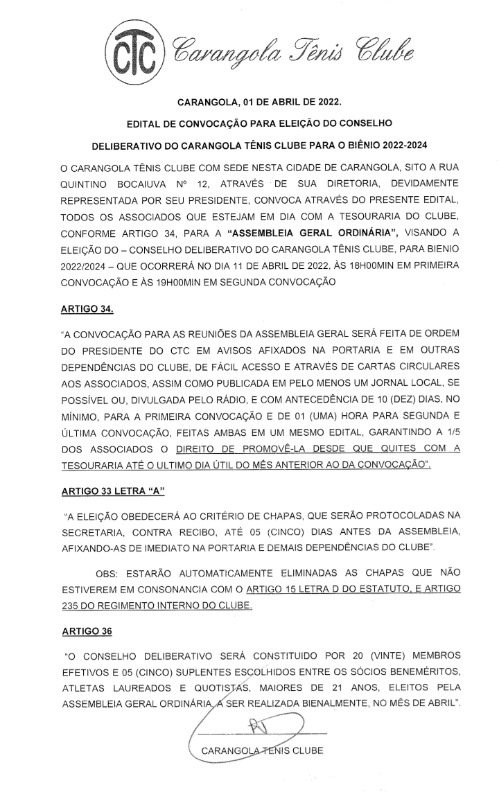 EDITAL DE CONVOCAÇÃO PARA ELEIÇÃO DO CONSELHO DELIBERATIVO DO CARANGOLA TÊNIS CLUBE PARA O BIÊNIO 2022-2024 1 de abril de 2022 Fonte: Carangola Tênis Clube