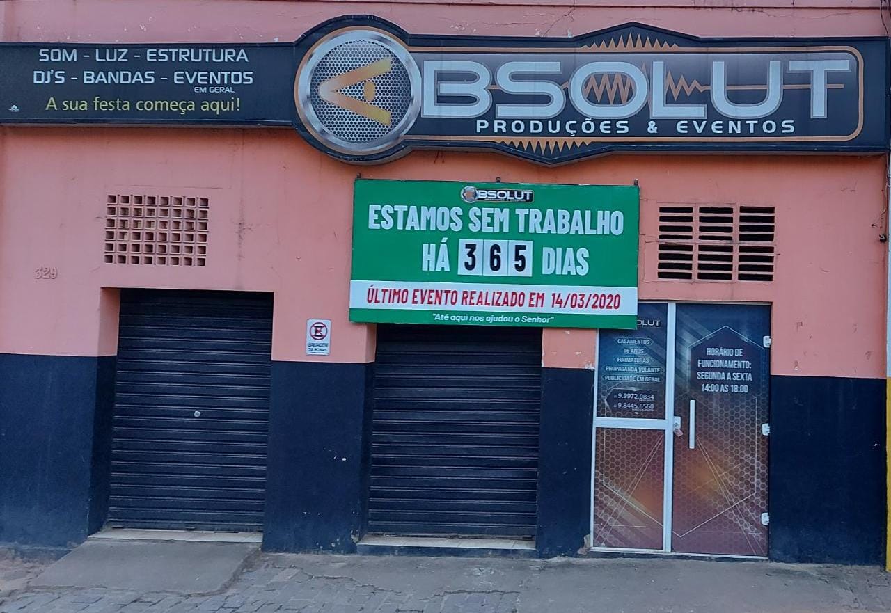 Uma grande placa em sua fachada principal informando que a empresa está há 365 dias sem trabalho. Essa foi a forma que os proprietários da empresa de eventos Absolut Produções de Carangola-MG encontraram para registrar essa triste marca e ao mesmo tempo realizar um protesto silencioso em prol do setor de eventos que vive a sua pior crise de todos os tempo em virtude da Pandemia do Coronavírus.