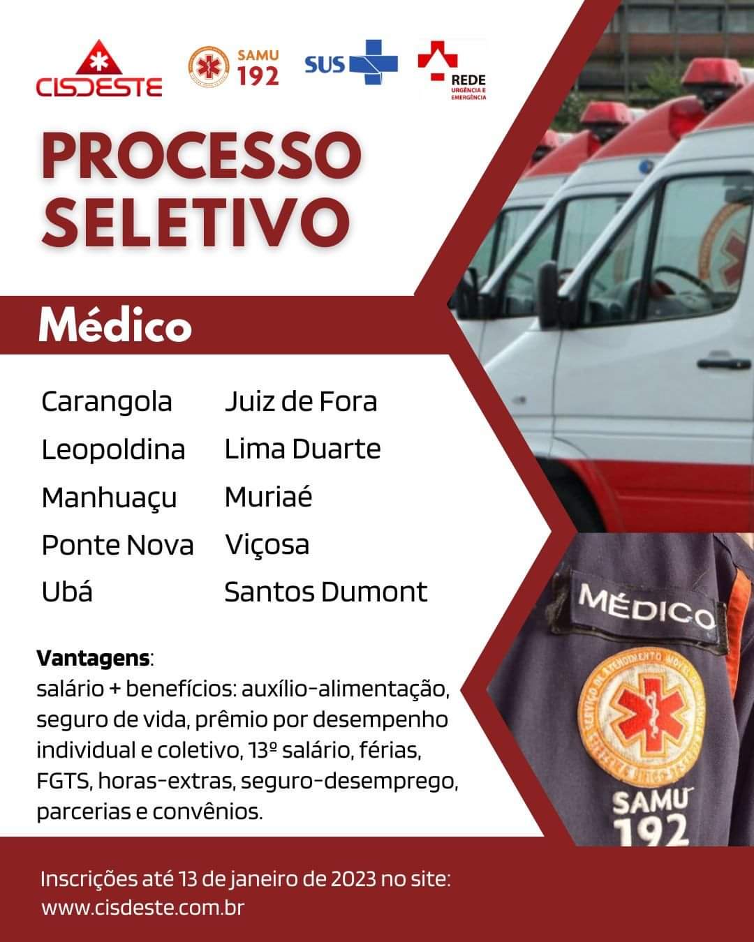 ESTÃO ABERTAS AS INSCRIÇÕES PARA O PROCESSO SELETIVO DO SAMU DE CARANGOLA E REGIÃO PARA O CARGO DE MÉDICO